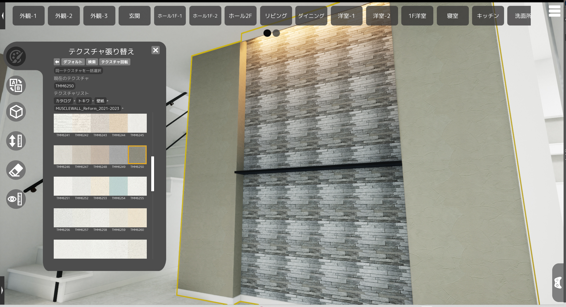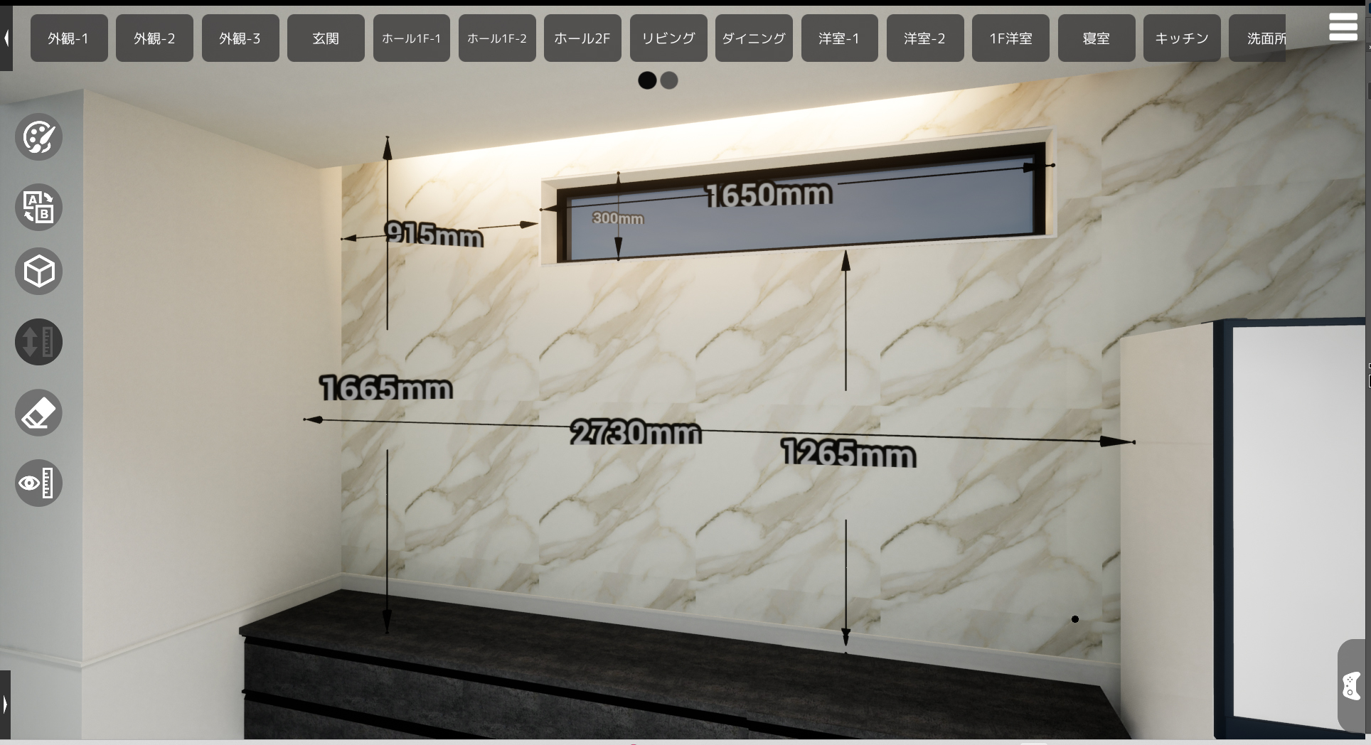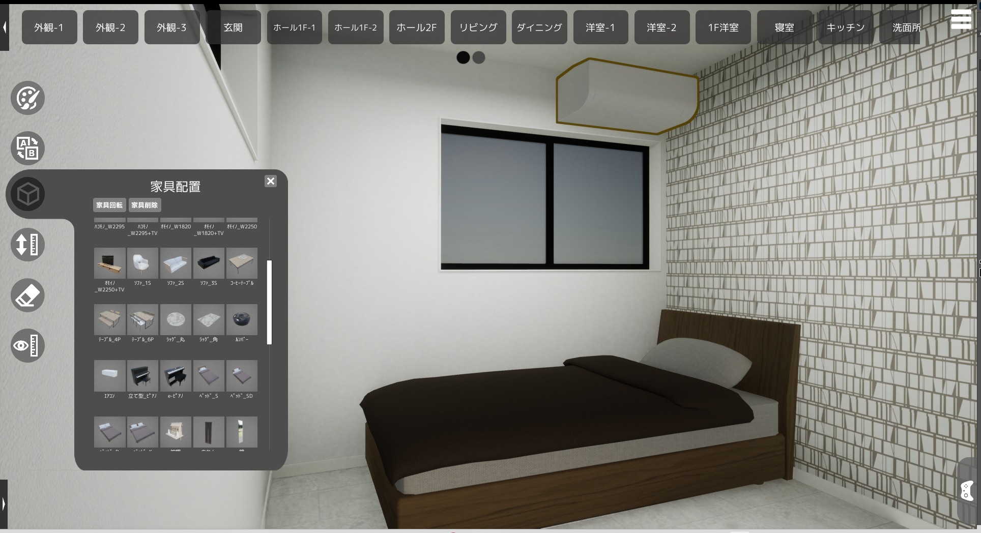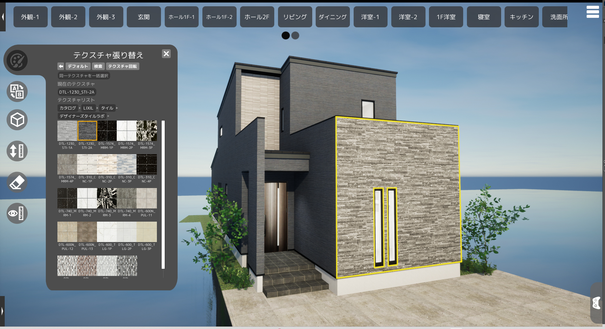 - アントールの独自システムで制作したアプリで、設計図を元に仮想空間に3DCGで表現し、実際に建てる前にマウス操作で内外自由にウォークスルーして完成イメージを確認することが出来るシステムです。また、メーカー建材を豊富に取り揃えており、外壁、壁紙、床、建具など、自由にコーディネートが可能なシステムとなっています。